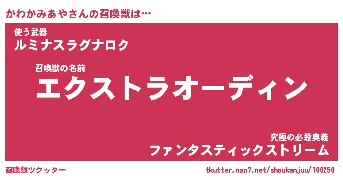 | ヒーロー風カッコイイあだ名 | 『スーパーカワカミアヤ』『天弓騎士カワ』 |