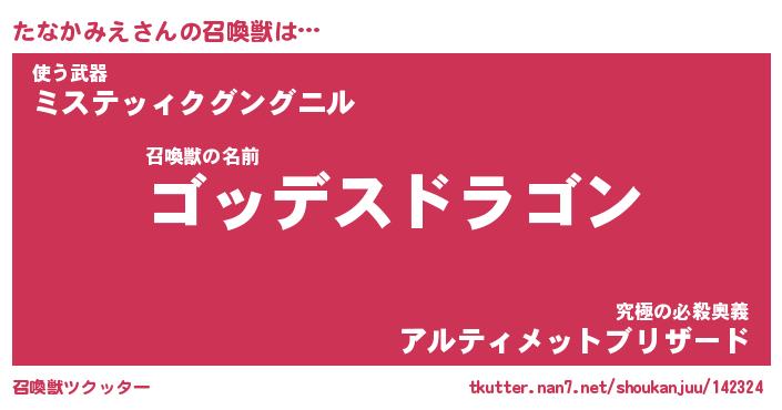 | ヒーロー風カッコイイあだ名 | 『スーパータナカミエ』『天弓騎士タナ』 |
