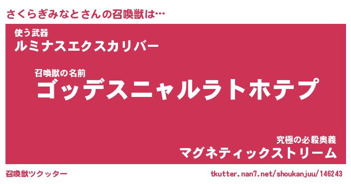 | 胡散臭い通販商品みたいなあだ名 | 『モテモテ間違いなし霊験あらたかなお札…その名も「さくらぎみなと」』 |