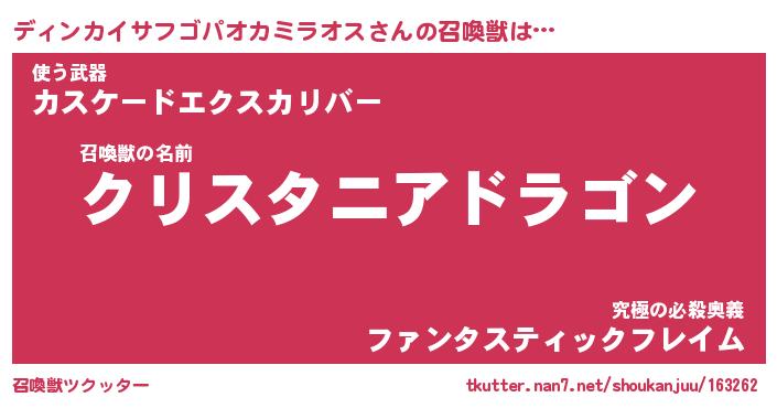 | ツイッター | ディンカイサフゴパオカミラオスさんのツイッターID『namakemono_man』 |