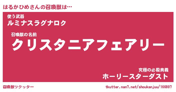 | ファンタジー風あだ名 | 『ハルフェル』『エターナルハルカヒメー』 |