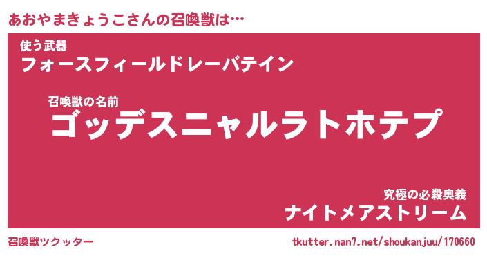 | 伝説のあだ名 | 『不死鳥のスナイパーあおやまきょうこ』 |