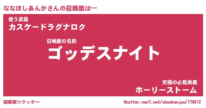 | 女子向けラノベタイトル風あだ名 | 『ななほしあんか姫と円卓の騎士』 |