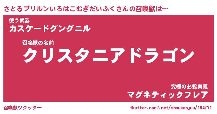 | 伝説のあだ名 | 『封印されし竜騎士さとるプリルンいろはこむぎだいふく』 |