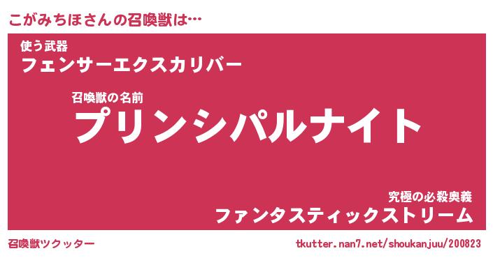| 女子向けラノベタイトル風あだ名 | 『こがみちほ姫と円卓の騎士』 |