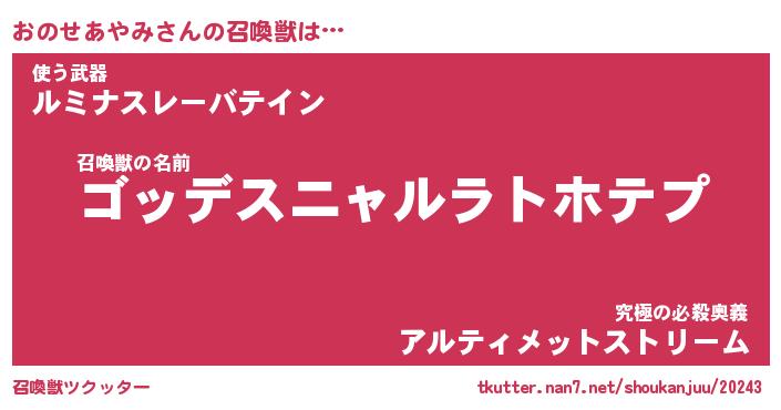 | 伝説のあだ名 | 『不死鳥のスナイパーおのせあやみ』 |