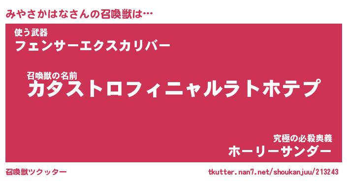 | ヒーロー風カッコイイあだ名 | 『スーパーミヤサカハナ』『炎刃騎士ミヤ』 |