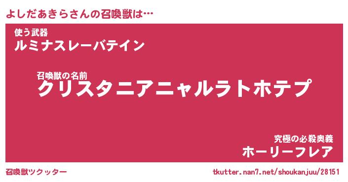 | ヒーロー風カッコイイあだ名 | 『スーパーヨシダアキラ』『黄金騎士ヨシ』 |