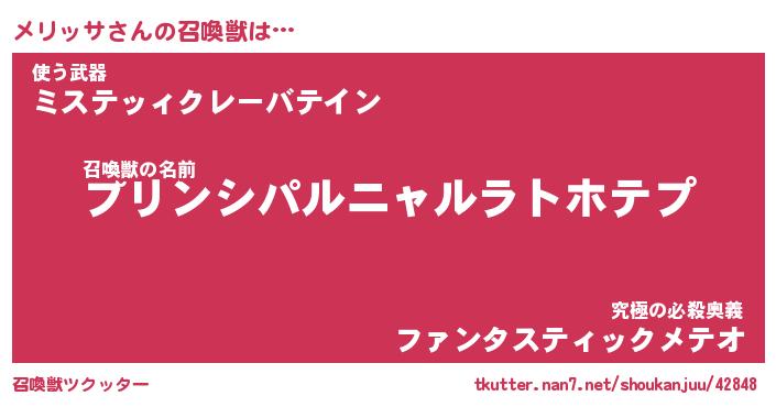 | 意味不明あだ名 | 『ペロリンメリッサ』『永久保存メリッサ』 |
