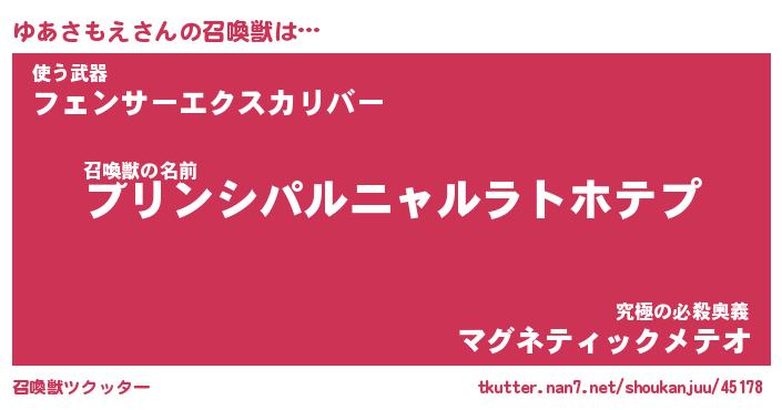 | 伝説のあだ名 | 『不死鳥のスナイパーゆあさもえ』 |