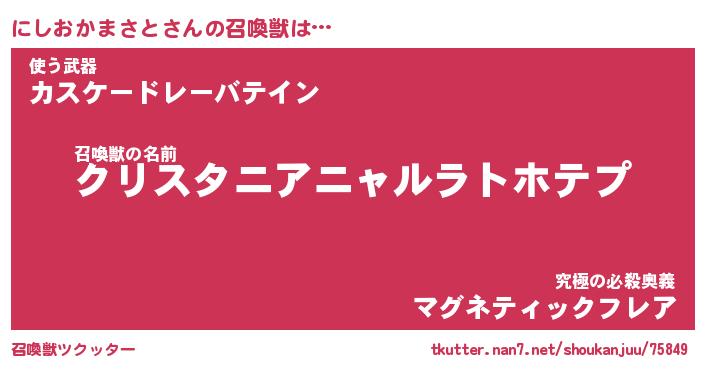 | 女子向けラノベタイトル風あだ名 | 『誰かこのにしおかまさとを説明してください! ~契約から始まるウェディング~』 |