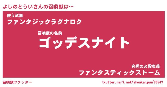 | ヒーロー風カッコイイあだ名 | 『スーパーヨシノトウイ』『天弓騎士ヨシ』 |