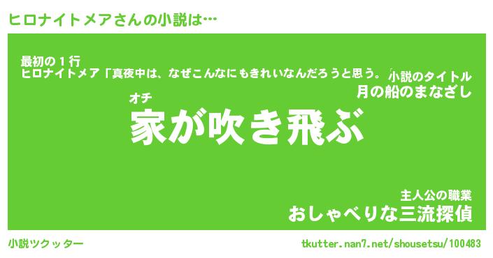 ヒロナイトメアさんの小説は… オチ『家が吹き飛ぶ』最初の1行『ヒロナイトメア「真夜中は、なぜこんなにもきれいなんだろうと思う。」』主人公の職業『おしゃべりな三流探偵』 ツクッター #小説ツクッター http://tkutter.nan7.net/shousetsu/100483/