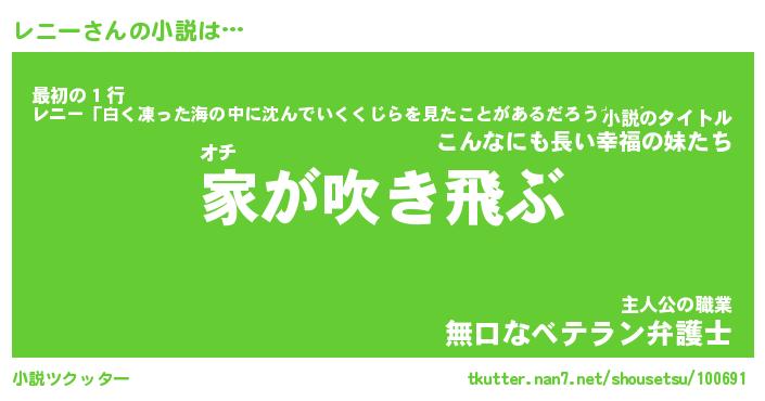 レニーさんの小説は… オチ『家が吹き飛ぶ』最初の1行『レニー「白く凍った海の中に沈んでいくくじらを見たことがあるだろうか。」』主人公の職業『無口なベテラン弁護士』 ツクッター #小説ツクッター http://tkutter.nan7.net/shousetsu/100691/