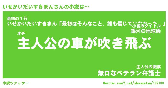 いせかいだいすきまんさんの小説は… オチ『主人公の車が吹き飛ぶ』最初の1行『いせかいだいすきまん「最初はそんなこと、誰も信じていなかった。」』主人公の職業『無口なベテラン弁護士』 ツクッター #小説ツクッター http://tkutter.nan7.net/shousetsu/102130/