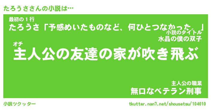 たろうささんの小説は… オチ『主人公の友達の家が吹き飛ぶ』最初の1行『たろうさ「予感めいたものなど、何ひとつなかった。」』主人公の職業『無口なベテラン刑事』 ツクッター #小説ツクッター http://tkutter.nan7.net/shousetsu/104010/