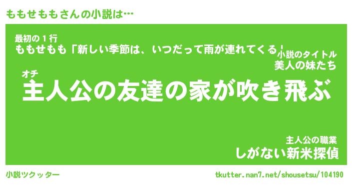 ももせももさんの小説は… オチ『主人公の友達の家が吹き飛ぶ』最初の1行『ももせもも「新しい季節は、いつだって雨が連れてくる」』主人公の職業『しがない新米探偵』 ツクッター #小説ツクッター http://tkutter.nan7.net/shousetsu/104190/