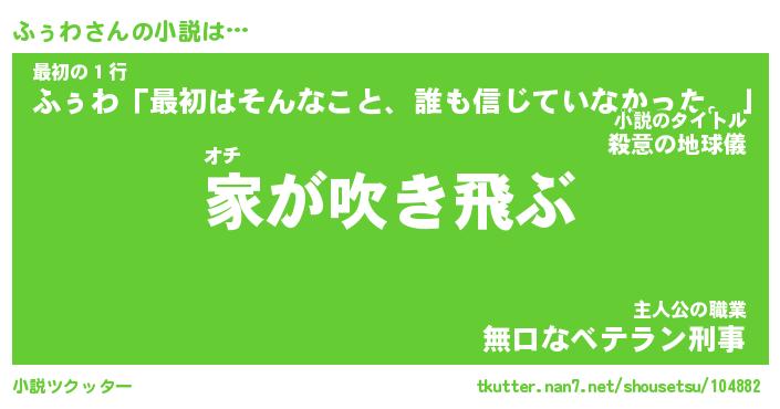 ふぅわさんの小説は… オチ『家が吹き飛ぶ』最初の1行『ふぅわ「最初はそんなこと、誰も信じていなかった。」』主人公の職業『無口なベテラン刑事』 ツクッター #小説ツクッター http://tkutter.nan7.net/shousetsu/104882/