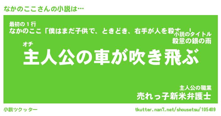 なかのここさんの小説は… オチ『主人公の車が吹き飛ぶ』最初の1行『なかのここ「僕はまだ子供で、ときどき、右手が人を殺す。」』主人公の職業『売れっ子新米弁護士』 ツクッター #小説ツクッター http://tkutter.nan7.net/shousetsu/105409/