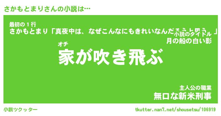 さかもとまりさんの小説は… オチ『家が吹き飛ぶ』最初の1行『さかもとまり「真夜中は、なぜこんなにもきれいなんだろうと思う。」』主人公の職業『無口な新米刑事』 ツクッター #小説ツクッター http://tkutter.nan7.net/shousetsu/106919/