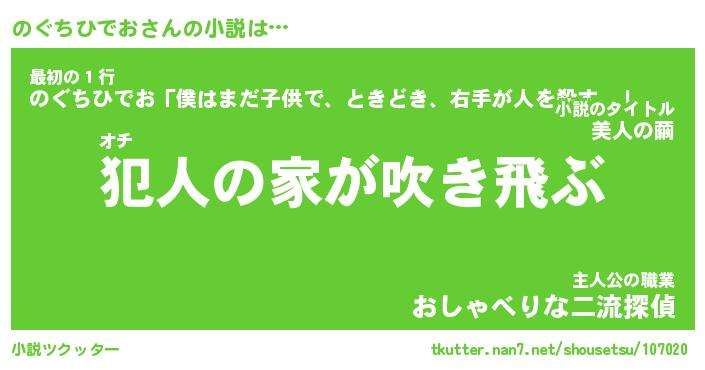 のぐちひでおさんの小説は… オチ『犯人の家が吹き飛ぶ』最初の1行『のぐちひでお「僕はまだ子供で、ときどき、右手が人を殺す。」』主人公の職業『おしゃべりな二流探偵』 ツクッター #小説ツクッター http://tkutter.nan7.net/shousetsu/107020/