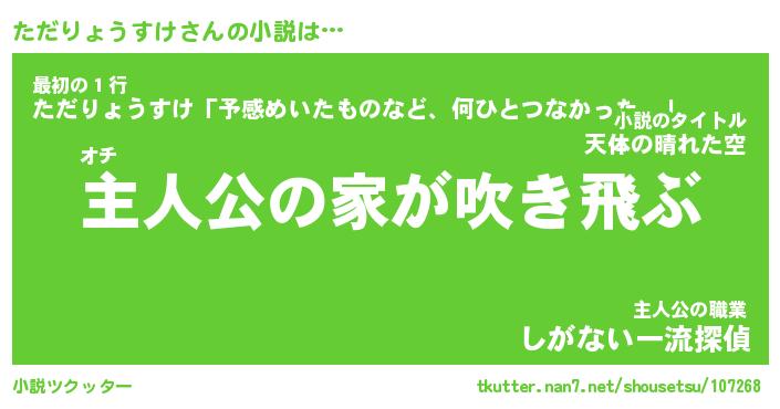 ただりょうすけさんの小説は… オチ『主人公の家が吹き飛ぶ』最初の1行『ただりょうすけ「予感めいたものなど、何ひとつなかった。」』主人公の職業『しがない一流探偵』 ツクッター #小説ツクッター http://tkutter.nan7.net/shousetsu/107268/