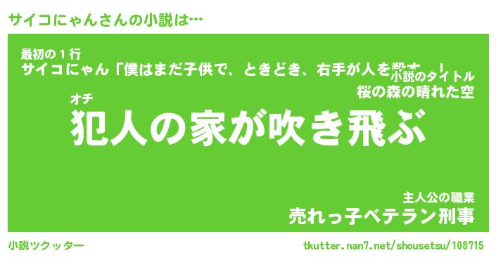 サイコにゃんさんの小説は… オチ『犯人の家が吹き飛ぶ』最初の1行『サイコにゃん「僕はまだ子供で、ときどき、右手が人を殺す。」』主人公の職業『売れっ子ベテラン刑事』 ツクッター #小説ツクッター http://tkutter.nan7.net/shousetsu/108715/