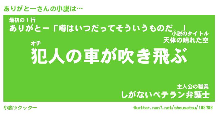 ありがとーさんの小説は… オチ『犯人の車が吹き飛ぶ』最初の1行『ありがとー「噂はいつだってそういうものだ。」』主人公の職業『しがないベテラン弁護士』 ツクッター #小説ツクッター http://tkutter.nan7.net/shousetsu/108788/