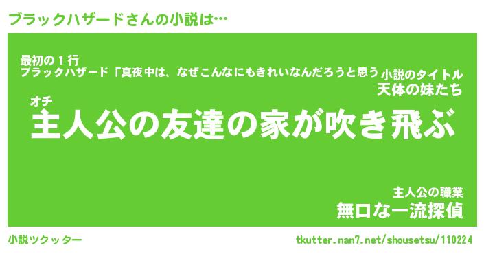 ブラックハザードさんの小説は… オチ『主人公の友達の家が吹き飛ぶ』最初の1行『ブラックハザード「真夜中は、なぜこんなにもきれいなんだろうと思う。」』主人公の職業『無口な一流探偵』 ツクッター #小説ツクッター http://tkutter.nan7.net/shousetsu/110224/