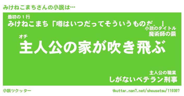 | 男性向けラノベタイトル風あだ名 | 『みけねこまちの憂鬱』 |