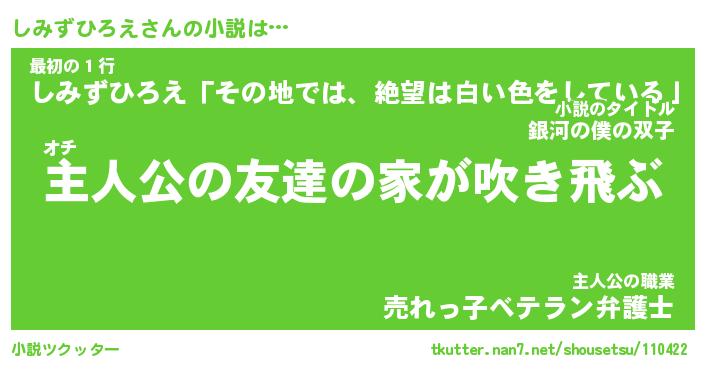 しみずひろえさんの小説は… オチ『主人公の友達の家が吹き飛ぶ』最初の1行『しみずひろえ「その地では、絶望は白い色をしている」』主人公の職業『売れっ子ベテラン弁護士』 ツクッター #小説ツクッター http://tkutter.nan7.net/shousetsu/110422/