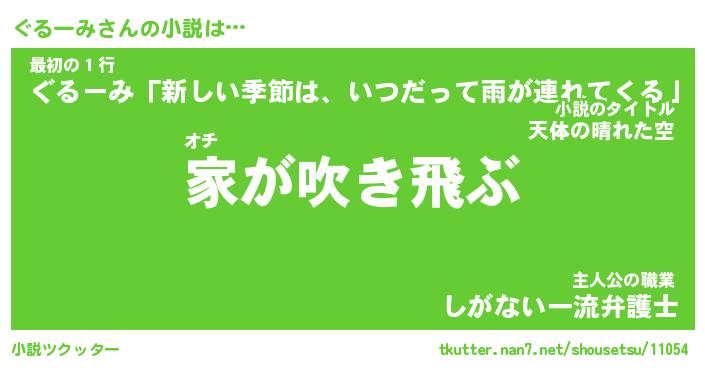 ぐるーみさんの小説は… オチ『家が吹き飛ぶ』最初の1行『ぐるーみ「新しい季節は、いつだって雨が連れてくる」』主人公の職業『しがない一流弁護士』 ツクッター #小説ツクッター http://tkutter.nan7.net/shousetsu/11054/