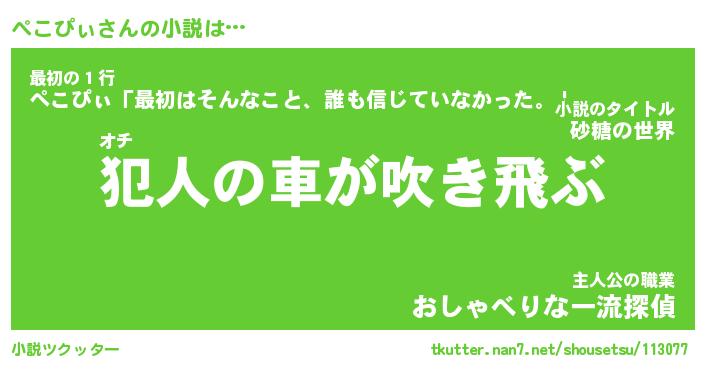 ぺこぴぃさんの小説は… オチ『犯人の車が吹き飛ぶ』最初の1行『ぺこぴぃ「最初はそんなこと、誰も信じていなかった。」』主人公の職業『おしゃべりな一流探偵』 ツクッター #小説ツクッター http://tkutter.nan7.net/shousetsu/113077/