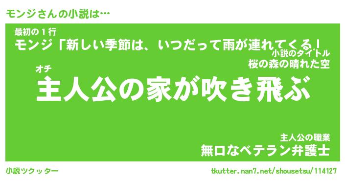 モンジさんの小説は… オチ『主人公の家が吹き飛ぶ』最初の1行『モンジ「新しい季節は、いつだって雨が連れてくる」』主人公の職業『無口なベテラン弁護士』 ツクッター #小説ツクッター http://tkutter.nan7.net/shousetsu/114127/