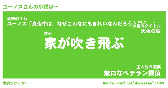 ユーノスさんの小説は… オチ『家が吹き飛ぶ』最初の1行『ユーノス「真夜中は、なぜこんなにもきれいなんだろうと思う。」』主人公の職業『無口なベテラン探偵』 ツクッター #小説ツクッター http://tkutter.nan7.net/shousetsu/114669/