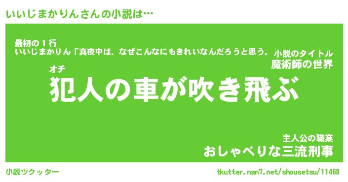 いいじまかりんさんの小説は… オチ『犯人の車が吹き飛ぶ』最初の1行『いいじまかりん「真夜中は、なぜこんなにもきれいなんだろうと思う。」』主人公の職業『おしゃべりな三流刑事』 ツクッター #小説ツクッター http://tkutter.nan7.net/shousetsu/11468/