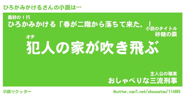 ひろかみかけるさんの小説は… オチ『犯人の家が吹き飛ぶ』最初の1行『ひろかみかける「春が二階から落ちて来た。」』主人公の職業『おしゃべりな三流刑事』 ツクッター #小説ツクッター http://tkutter.nan7.net/shousetsu/114985/