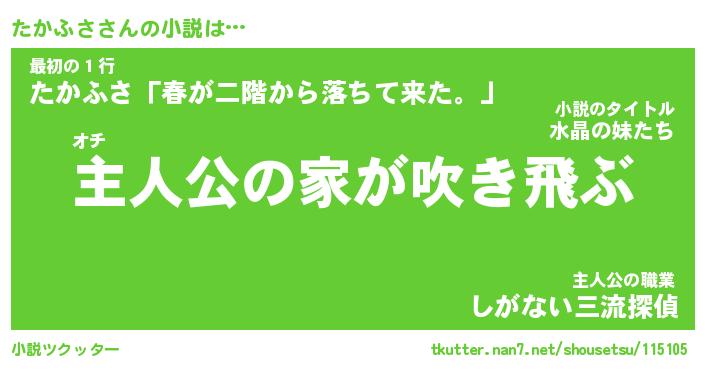 たかふささんの小説は… オチ『主人公の家が吹き飛ぶ』最初の1行『たかふさ「春が二階から落ちて来た。」』主人公の職業『しがない三流探偵』 ツクッター #小説ツクッター http://tkutter.nan7.net/shousetsu/115105/