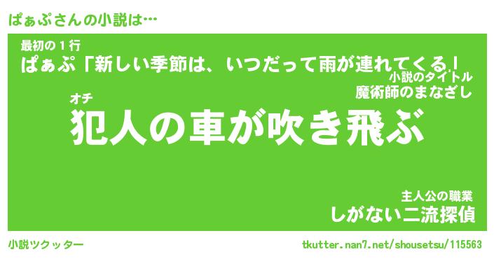 ぱぁぷさんの小説は… オチ『犯人の車が吹き飛ぶ』最初の1行『ぱぁぷ「新しい季節は、いつだって雨が連れてくる」』主人公の職業『しがない二流探偵』 ツクッター #小説ツクッター http://tkutter.nan7.net/shousetsu/115563/