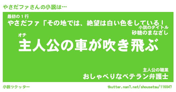 やさだファさんの小説は… オチ『主人公の車が吹き飛ぶ』最初の1行『やさだファ「その地では、絶望は白い色をしている」』主人公の職業『おしゃべりなベテラン弁護士』 ツクッター #小説ツクッター http://tkutter.nan7.net/shousetsu/116047/