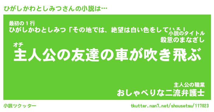 | ツイッター | ひがしかわとしみつさんのツイッターID『dendenmushi_star』 |