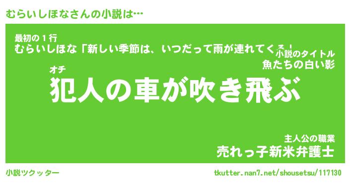 むらいしほなさんの小説は… オチ『犯人の車が吹き飛ぶ』最初の1行『むらいしほな「新しい季節は、いつだって雨が連れてくる」』主人公の職業『売れっ子新米弁護士』 ツクッター #小説ツクッター http://tkutter.nan7.net/shousetsu/117130/