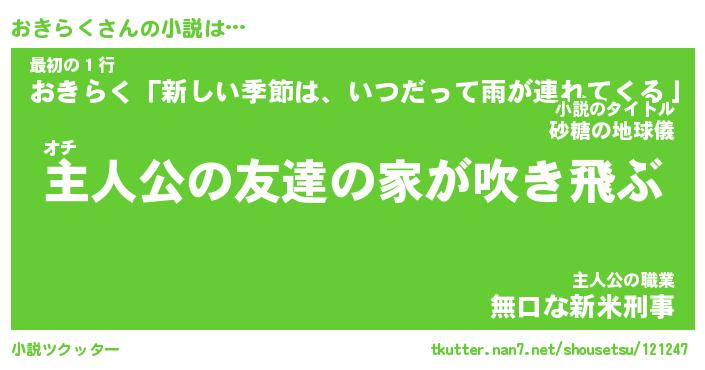 おきらくさんの小説は… オチ『主人公の友達の家が吹き飛ぶ』最初の1行『おきらく「新しい季節は、いつだって雨が連れてくる」』主人公の職業『無口な新米刑事』 ツクッター #小説ツクッター http://tkutter.nan7.net/shousetsu/121247/