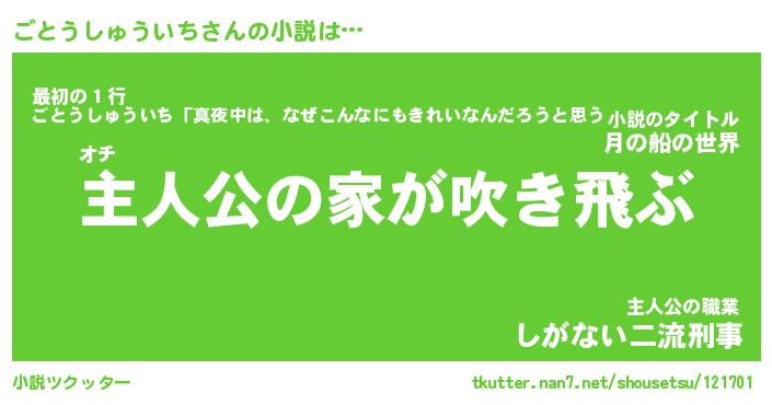 ごとうしゅういちさんの小説は… オチ『主人公の家が吹き飛ぶ』最初の1行『ごとうしゅういち「真夜中は、なぜこんなにもきれいなんだろうと思う。」』主人公の職業『しがない二流刑事』 ツクッター #小説ツクッター http://tkutter.nan7.net/shousetsu/121701/