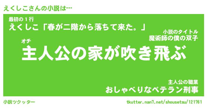えくしこさんの小説は… オチ『主人公の家が吹き飛ぶ』最初の1行『えくしこ「春が二階から落ちて来た。」』主人公の職業『おしゃべりなベテラン刑事』 ツクッター #小説ツクッター http://tkutter.nan7.net/shousetsu/121761/