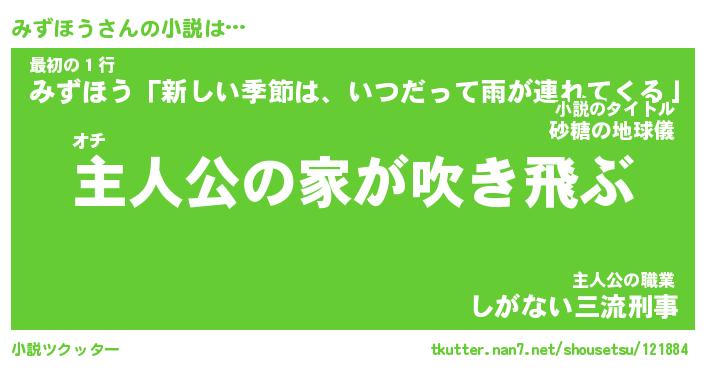 みずほうさんの小説は… オチ『主人公の家が吹き飛ぶ』最初の1行『みずほう「新しい季節は、いつだって雨が連れてくる」』主人公の職業『しがない三流刑事』 ツクッター #小説ツクッター http://tkutter.nan7.net/shousetsu/121884/