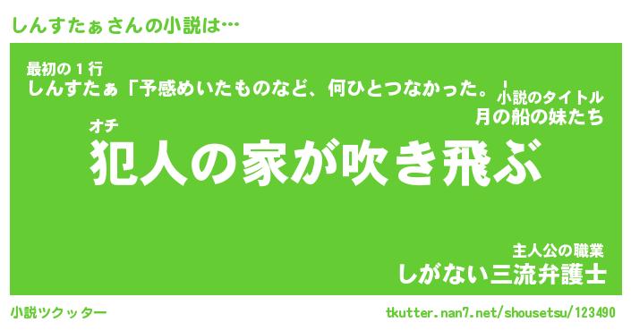 しんすたぁさんの小説は… オチ『犯人の家が吹き飛ぶ』最初の1行『しんすたぁ「予感めいたものなど、何ひとつなかった。」』主人公の職業『しがない三流弁護士』 ツクッター #小説ツクッター http://tkutter.nan7.net/shousetsu/123490/