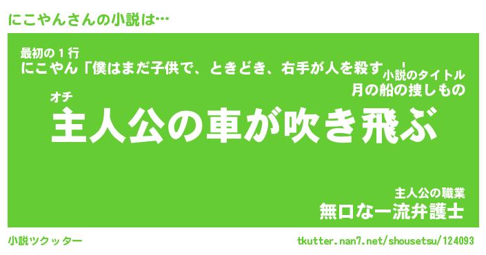 にこやんさんの小説は… オチ『主人公の車が吹き飛ぶ』最初の1行『にこやん「僕はまだ子供で、ときどき、右手が人を殺す。」』主人公の職業『無口な一流弁護士』 ツクッター #小説ツクッター http://tkutter.nan7.net/shousetsu/124093/