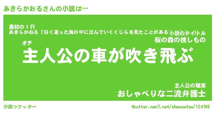 あきらかおるさんの小説は… オチ『主人公の車が吹き飛ぶ』最初の1行『あきらかおる「白く凍った海の中に沈んでいくくじらを見たことがあるだろうか。」』主人公の職業『おしゃべりな二流弁護士』 ツクッター #小説ツクッター http://tkutter.nan7.net/shousetsu/124100/
