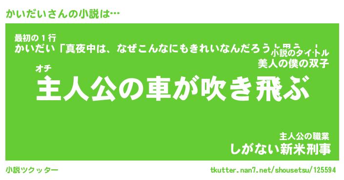 かいだいさんの小説は… オチ『主人公の車が吹き飛ぶ』最初の1行『かいだい「真夜中は、なぜこんなにもきれいなんだろうと思う。」』主人公の職業『しがない新米刑事』 ツクッター #小説ツクッター http://tkutter.nan7.net/shousetsu/125594/
